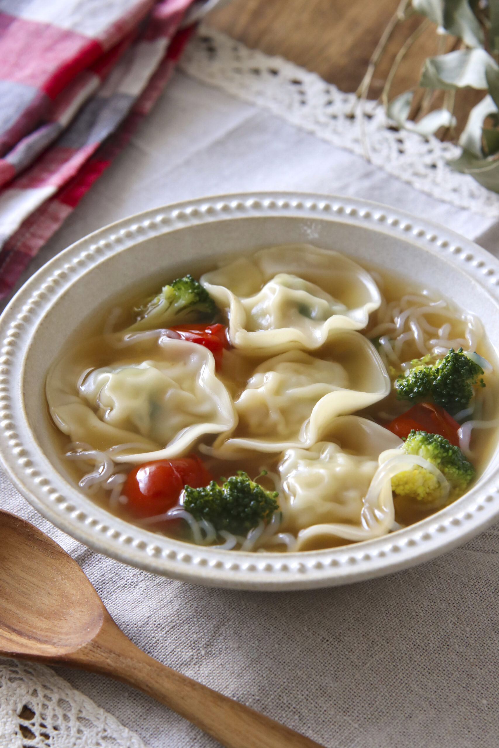 - 4に3を1つずつ入れ、1分ほど中火で煮込んだらミニトマトを加え、さらに2分程煮込んだらブロッコリーを加える。計5分加熱し、火を止める。